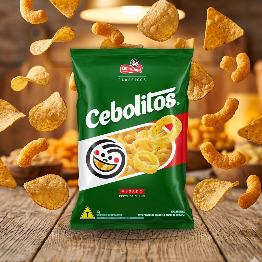 O snack de milho com o irresistível sabor de cebola – Formato de anéis divertidos e uma crocância que conquista desde a primeira mordida.